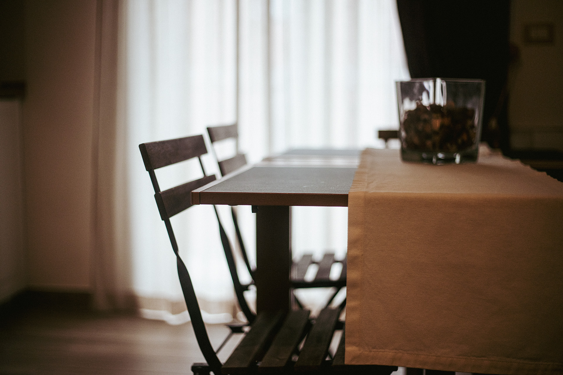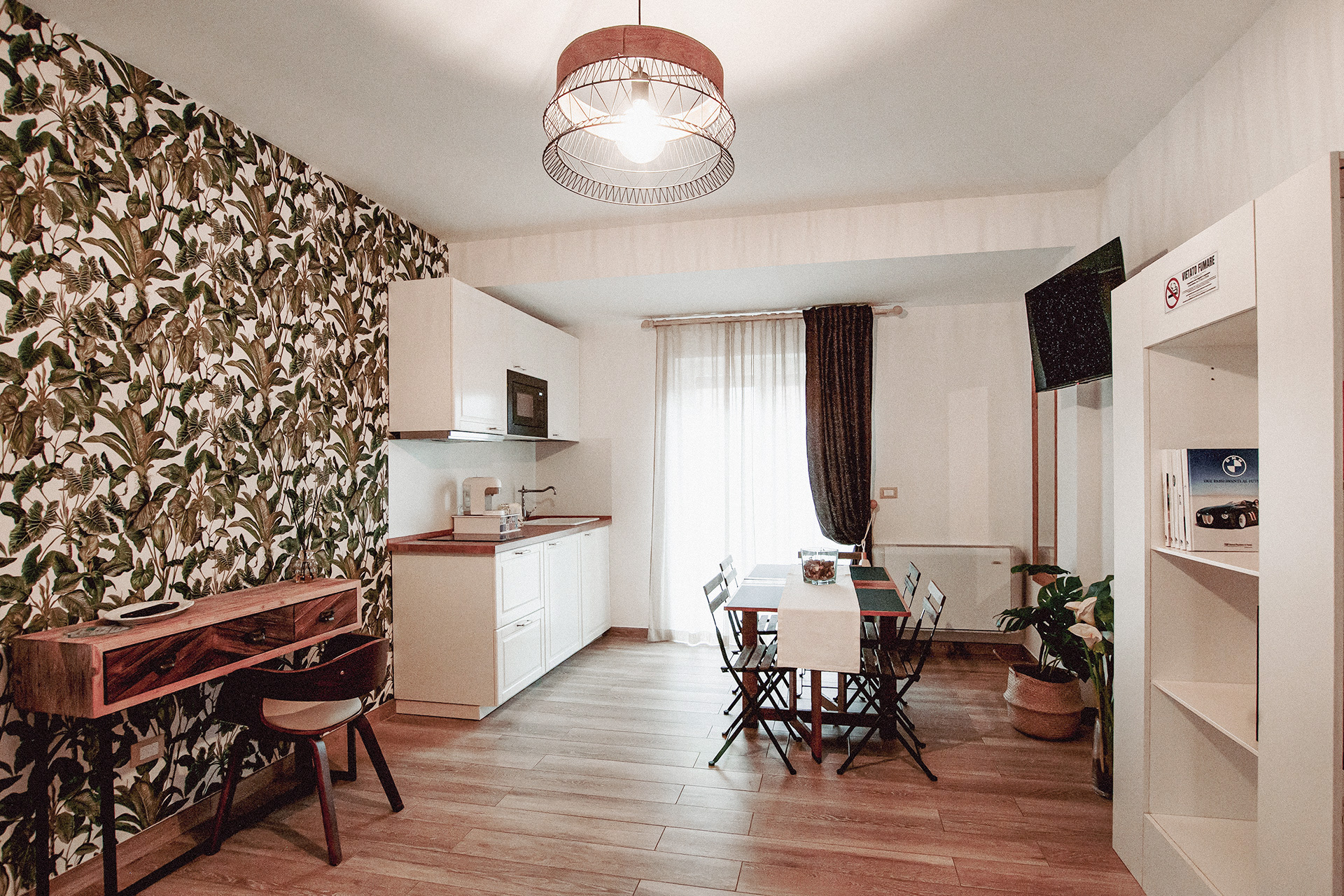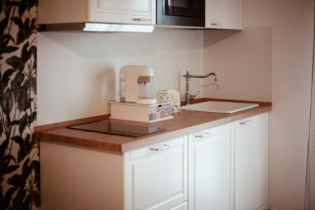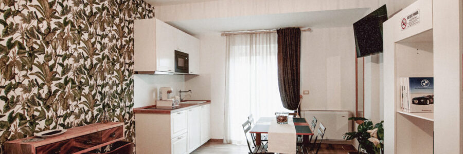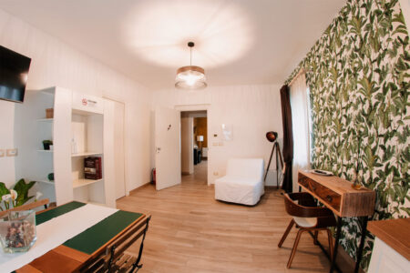 Il tavolo da pranzo invita alla lentezza di una colazione senza fretta o a una pausa dopo una giornata tra mare e centro storico. La presenza della cucina attrezzata offre autonomia e praticità, mantenendo sempre quell’atmosfera discreta e familiare che caratterizza l’intera struttura.